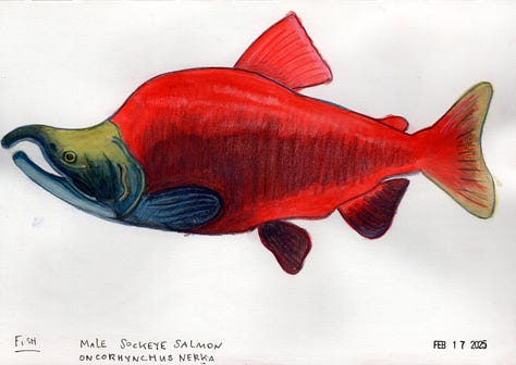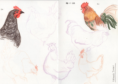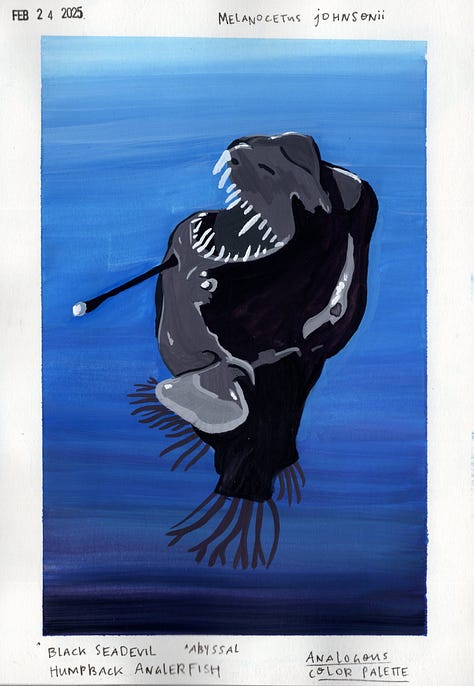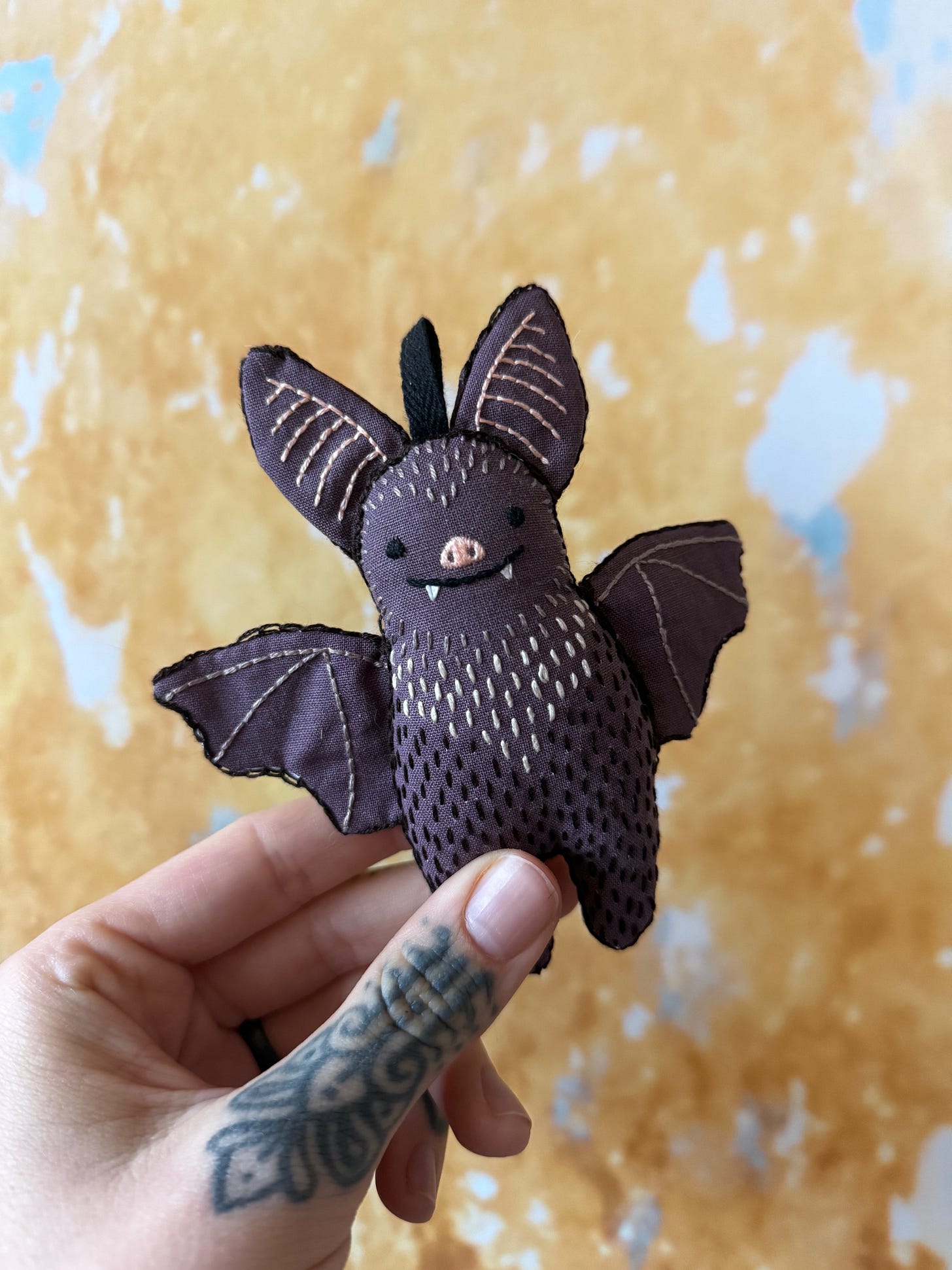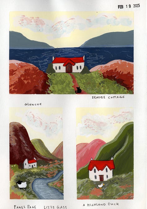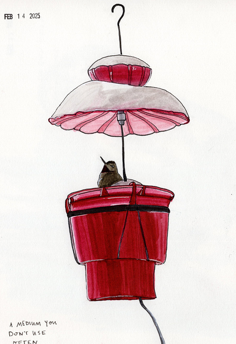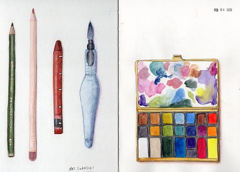 I thought I was making progress in the self-compassion department and then February (and DOGE) came along. I realized I needed to scale back after a busy holiday season of making and teaching, so I decided to take the month off from sewing. To respect my period of lower capacity, I focused on projects that encouraged working at a slower pace (like the adorable bat from Kiriki Press that I embroidered by hand). And to accommodate my low motivation, I infused my creative practice with a bit of novelty by participating in Katie Moody’s 30 Days of Sketchbook Joy challenge (on a daily-ish schedule with permission to skip days and prompts as needed). I’ve enjoyed the breadth and flexibility of the prompts and felt inspired by the art other participants have been sharing on social media. Watercolors and colored pencils are my go-to media, but I started experimenting with gouache for the first time during this challenge and love working with it.
