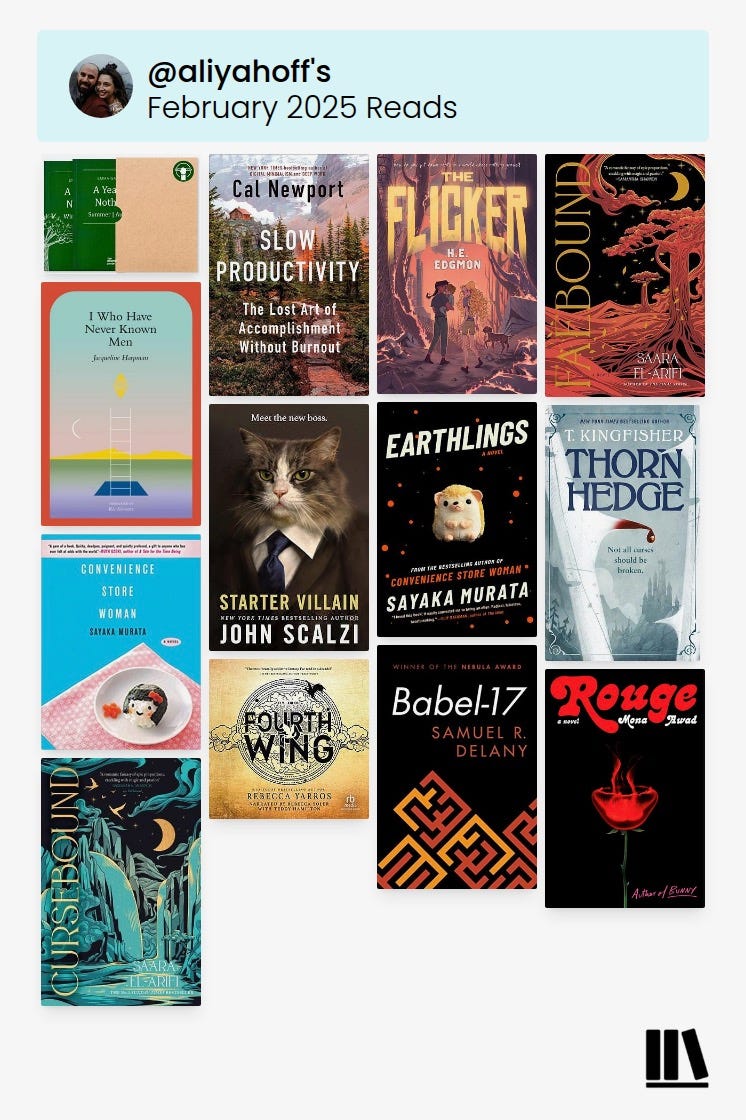 In an attempt to further divest from Amazon, I switched from my beloved Kindle to a Kobo Libra Colour and I am OBSESSED. I read 13 books during the month of February!!! Some favorites: Rouge, Starter Villain, I Who Have Never Known Men, Babel-17, and The Flicker. Can you tell I have been Very Influenced by the Parallel Worlds and Always Here bookclubs?