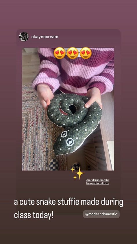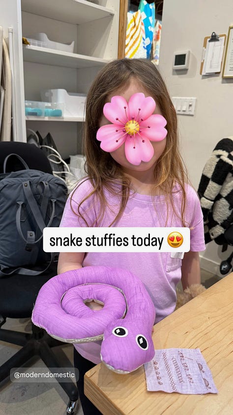 I try to offer new sewing classes for kids each month at Modern Domestic. This month, we celebrated Lunar New Year by sewing a Year of the Snake stuffie! The kiddos learned how to sew curves on a sewing machine, add stuffing, and finish their snakes with a bit of hand sewing. Click on the photos below to see some of my favorites.
